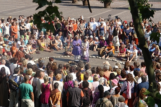 Während auf dem Vorplatz schamanische Trommelmusik zur Einstimmung auf die weltweite Vereinigung für Gebet und Heilung der Erde ertönte, bereiteten sich die 13 Großmütter auf einen Bewusstsein-Erweckungs-Marathon vom 19.-21. Juli 2013 vor – ausgehend von Karlsruhe für ganz Europa, für die ganze Welt.