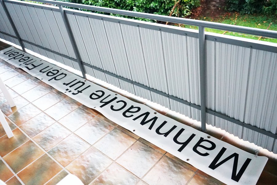 ARCHE BannerMahnwacheFürDenFrieden_01 ← Zurück Weiter → Vor den heftigen Sturmböen in Sicherheit gebracht.