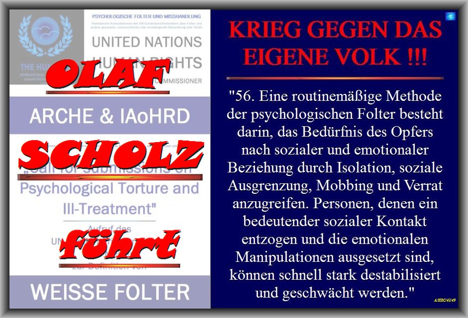 „Eine routinemäßige Methode der psychologischen Folter besteht darin, das Bedürfnis des Opfers nach sozialer und emotionaler Beziehung durch Isolation, soziale Ausgrenzung, Mobbing und Verrat anzugreifen. Personen, denen ein bedeutender sozialer Kontakt entzogen und die emotionalen Manipulationen ausgesetzt sind, können schnell stark destabilisiert und geschwächt werden.“ Plakat und Foto: Heiderose Manthey.